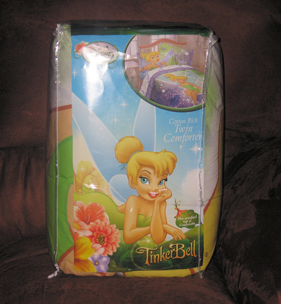 So how much did my splurge at Walmart just cost me? $180. Which I guess isn't too bad for a king sized bed in a bag (2 pillow shams, comforter, bed skirt), 4 matching decorative pillows and Hailey's comforter and sheet set. They are both really nice. I got my baby blue / milk chocolate set I have been eying. It's so soft. It's microfiber - like the couch! It looks really warm, which will be nice in the cooler months for sure (we keep the house practically set to arctic anyways). And of course, I bought Hailey a Tinkerbell set. I sort of settled on what they had rather than going for one I saw online. I learned with her birthday party that sometimes it's better to just settle for what is just as good because shipping costs are outrageous. I doubt she'll care either way. She's only 2 1/2. It has Tinkerbell on it and that's all that matters to her!