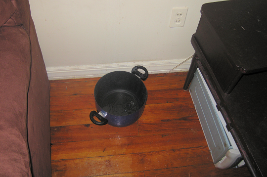 Being that it was already about 6:15pm and also dark from the storm, I couldn't see all that well, so taking good pictures was difficult. I put the pot down and lined it up with the dripping as best I could, then lined the area with towels. My poor hardwood floors!